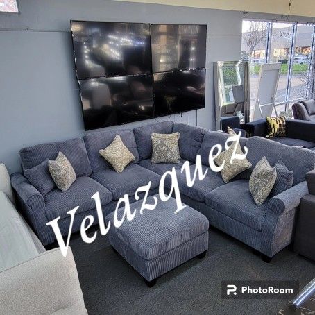 | Characteristics of goods | Sectional measures 99" x 99" x 34" x 35" H. This plush L-shaped sectional is a spacious gathering spot to entertain friends and family. The sectional stands in low legs that are just barely visible giving it its modern look.✅️✅️4 pc dark grey corduroy fabric sectional sofa with rounded arms and ottoman. This set includes the LAF / RAF love seat, corner wedge and ottoman. Ottoman measures 29" x 29" x 19" H.$498+ sale tax $550 cash 💸 💰 only ✅️ delivery is not available ✅️ The set includes a Left and right Loveseat with a corner wedge, 2 throw pillows and a matching ottoman. This set is KD , Requires assembly. It’s wrapped in super soft corduroy in a warm neutral hue that makes it even more inviting to family and friends. | ||